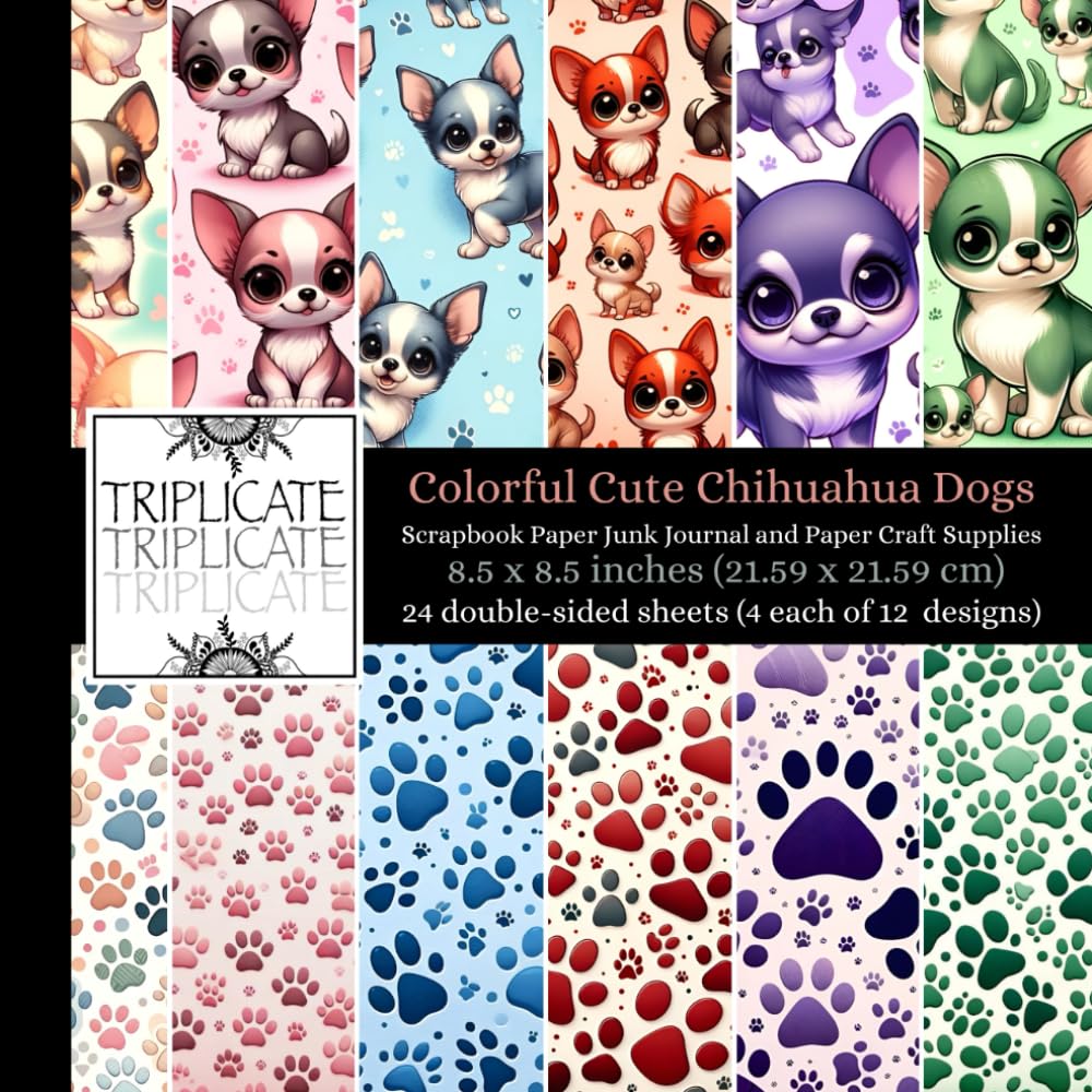Introducing our Colorful Cute Chihuahua Dogs Scrapbook Paper Junk Journal and Paper Craft Supplies. Dive into puppy patterns with this delightful collection of decorative craft paper designs. Perfect for paper crafting and scrapbooking enthusiasts, this 48-page book features 12 unique double-sided sheets in an 8.5 x 8.5 inch format (4 of each design).