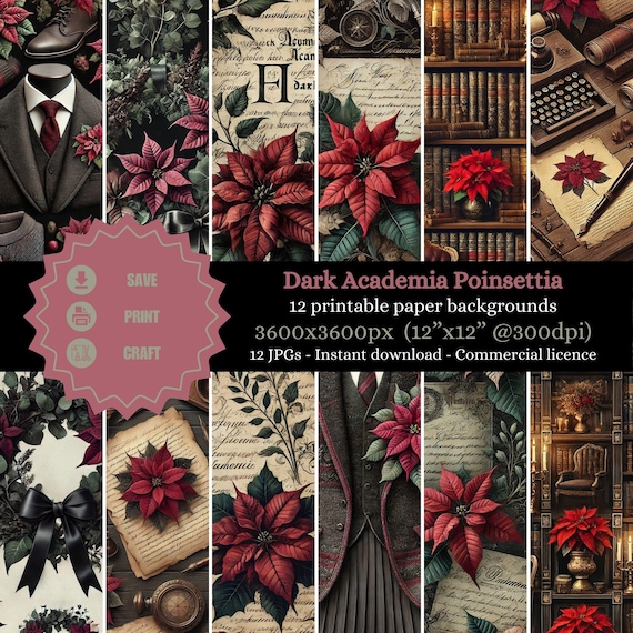 Infuse your winter crafts with the sophisticated charm of the Dark Academia Poinsettia Printable Scrapbook Paper collection. This set of 12 high-quality JPG files blends the moody aesthetics of dark academia with elegant, vintage-inspired poinsettia motifs. Each design is 12” x 12” at 300 DPI, ensuring crisp and detailed prints perfect for any project.