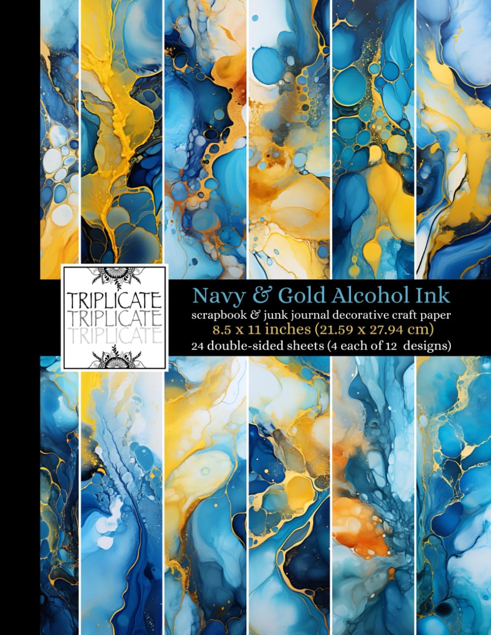 Introducing our Navy Blue and Gold Alcohol Ink Scrapbook and Junk Journal Decorative Craft Paper. Dive into fluid art with this delightful collection of decorative craft paper designs. Perfect for paper crafting and scrapbooking enthusiasts, this 48-page book features 12 unique double-sided sheets in an 8.5 x 11 inch format (4 of each design).