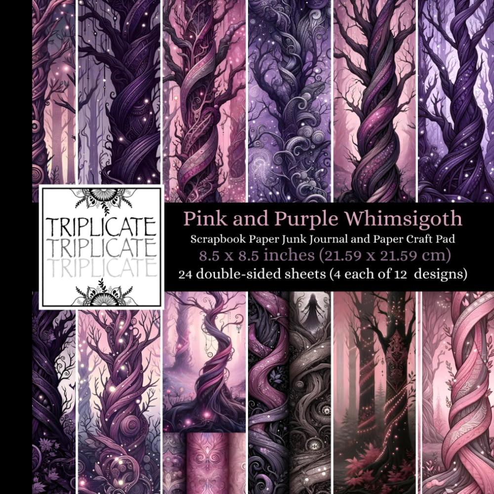 Introducing our Pink and Purple Whimsigoth Scrapbook Paper Junk Journal and Paper Craft Pad. Dive into crafting with this delightful collection of decorative craft paper designs. Perfect for paper crafting and scrapbooking enthusiasts, this 48-page pad features 12 unique designs on 24 double-sided sheets in an 8.5 x 8.5 inch format (4 of each design).